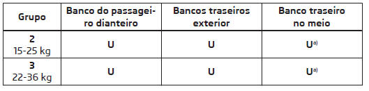 a) Se o banco do meio traseiro não está equipado com nenhum encosto de cabeça, a cadeira de criança do grupo 2 ou 3 só pode ser utilizada se esta estiver equipada com um encosto de cabeça integrado. Se a cadeira de criança do grupo 2 ou 3 não estiver equipada com nenhum encosto de cabeça integrado, tem de instalar a cadeira de criança no banco traseiro exterior.